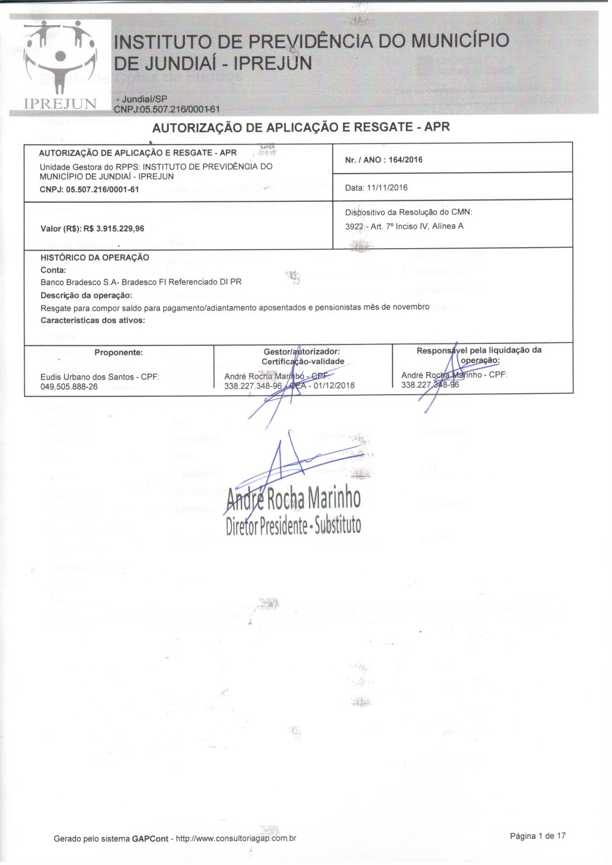 | 2016 | 164 | 11/11/2016 | 3.915.229,96 | APR | |